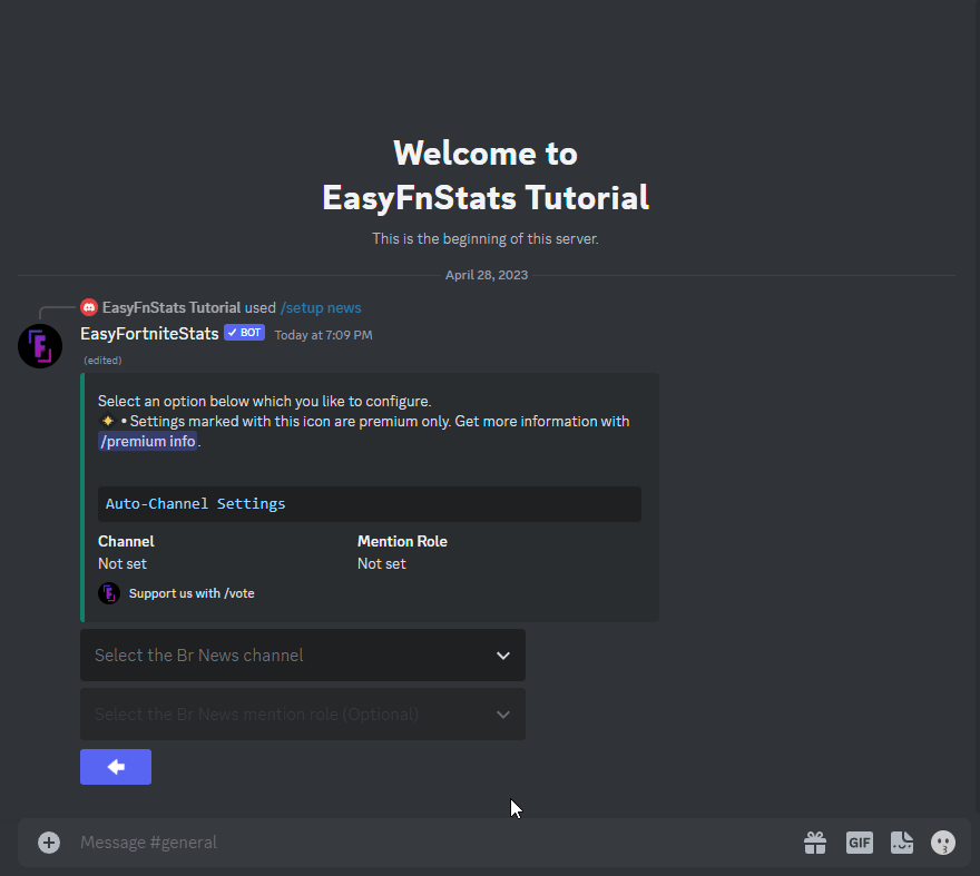 Now you need to **select** at least one **channel** where the News will be broadcast. Optionally, you can select a role that should always be mentioned.